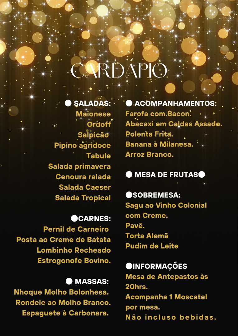 Participe do nosso jantar de ano novo e celebre a chegada de 2025 em grande estilo. Não perca essa oportunidade de começar o ano ao lado de pessoas especiais e com uma deliciosa refeição e uma festa muito animada, após o jantar!