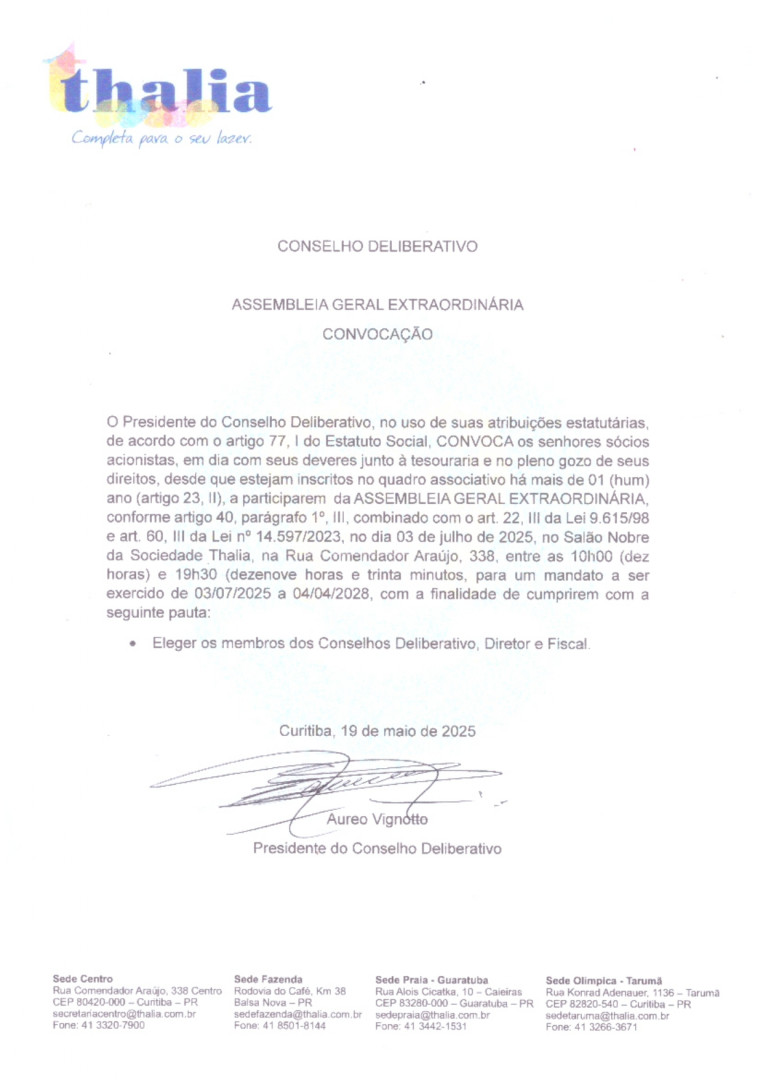Convocamos todos vocês a se juntarem a nós na ASSEMBLEIA GERAL EXTRAORDINÁRIA no dia 03 de julho de 2025, no Salão Nobre da Sociedade Thalia. Venha participar da eleição dos novos membros dos nossos Conselhos Deliberativo, Diretor e Fiscal!